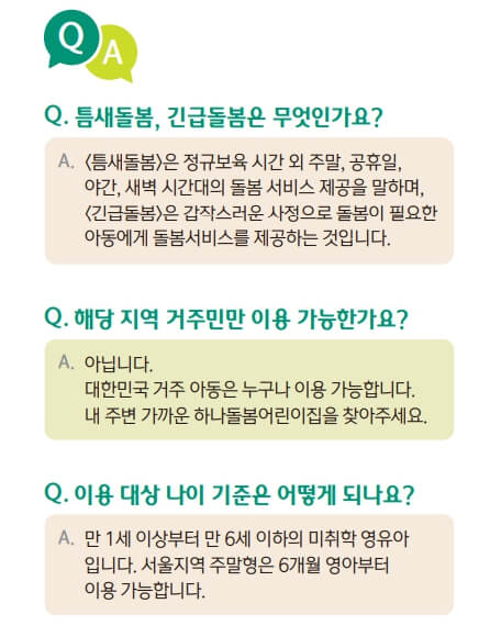 하나 돌봄 어린이집의 경우 보호자가 경제활동을 하는 경우가 1순위입니다. 기타 사유의 경우 2순위인데, 일주일 전 잔여 서비스 인원이 남아 있을 경우 이용이 가능합니다. 아이들 간식을 따로 제공하지 않습니다. 기저귀, 여벌 옷 및 개인침구를 포함 간식은 별도로 준비가 필요합니다.