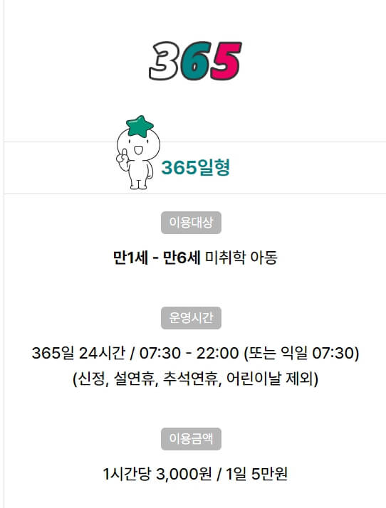365 일형, 주말공휴일형 2가지 서비스 모두 만 1세 ~ 만 6세 미취학 아동이 이용대상입니다.